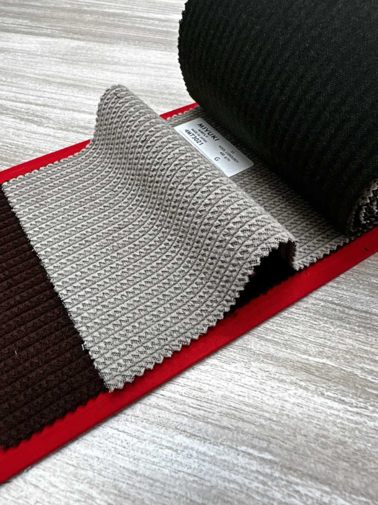 This collection combines various outerwear fabrics possible with wool, including those blended with different materials like worsted, woolen, and cotton. The brand pursues quality suitable for each item through consistent manufacturing, from raw material selection and design to finishing. The ranked fabric is AIRFLY Corduroy made from 100% fine wool, which, unlike cotton, features the characteristic warmth and high quality of wool. It is highly recommended for set-up garments!